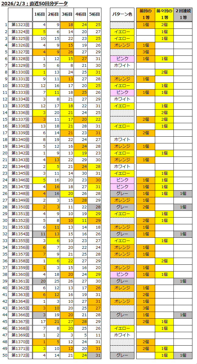 直近50回分のデータを羅列。毎週更新していて、「前回の1等」や「前々回の1等」の出現状況を『色』で表現してある。