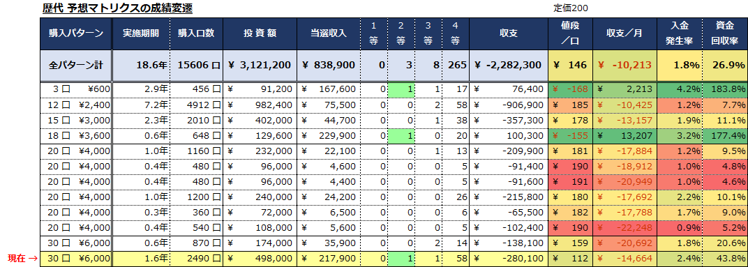 2007年8月14日から休むことなく買い続けている「通算の実績」をまとめた成績表です。17年以上かけてとはいえ、これだけの金額を負けていると正直こわい。
